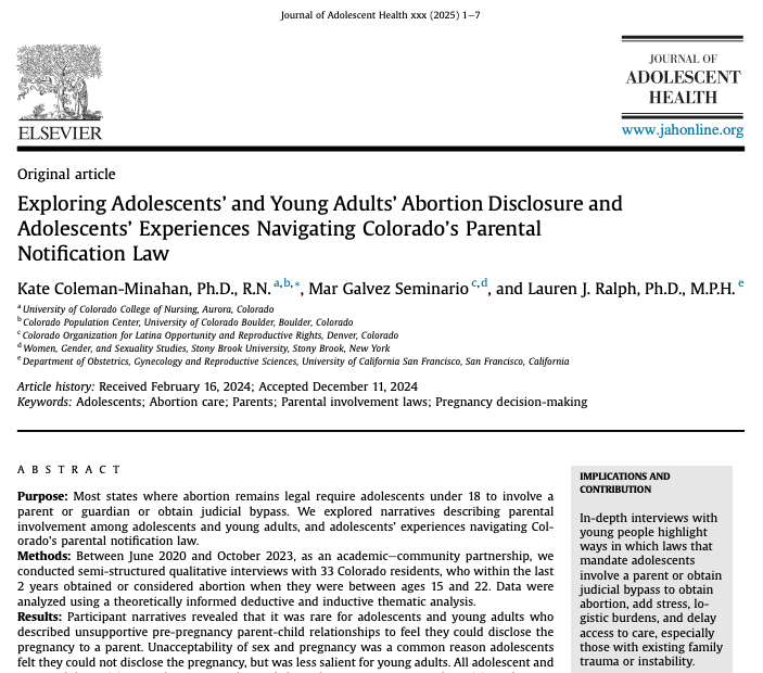 Youth Abortion Project (qualitative research project on parental involvement laws and medication abortion access); overseen by Kate Coleman-Minahan at the University of Colorado Anschutz